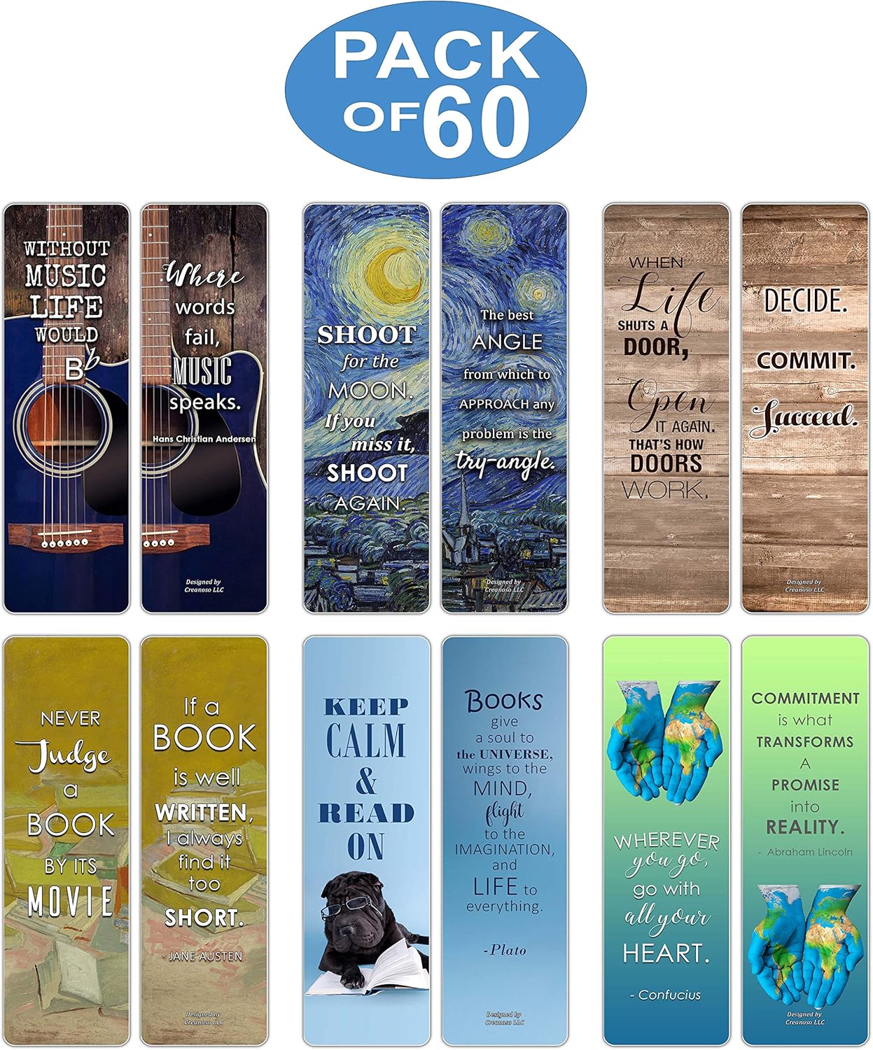 Creanoso Awesome Bookmarks contain famous and inspirational quotes that are a great way to mark your page. These cool bookmarks are made from quality material, very lightweight and colorful designs.
